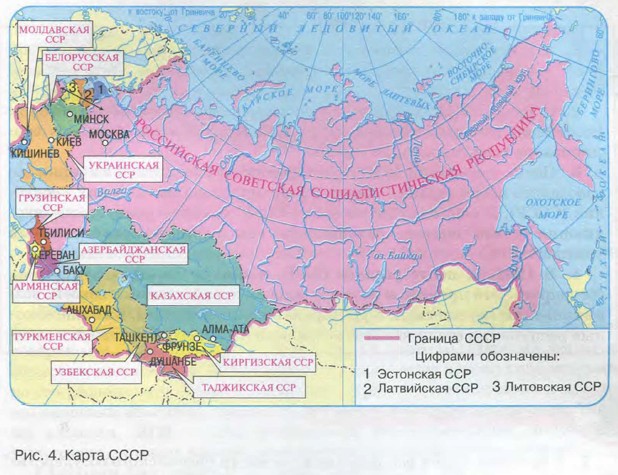 Россия на карте мира. Природные условия и ресурсы России Формирование территории РоссииК XIX в. формирование северной и западной части территории Российской империи закончилось. На юге расширение границ империи происходило за счёт присоединения предгорных районов Кавказа, территории Средней Азии и юга Дальнего Востока. Расширение границ империи в этих направлениях сопровождалось появлением новых городов на Кавказе (Черкесск, Нальчик, Грозный, Махачкала, Майкоп), в Средней Азии (Алма- Ата, Пишпек (ныне Бишкек), Ашхабад), на Дальнем Востоке (Благовещенск, Владивосток). Россия в XX в.После Октябрьской революции 1917 г. на территории Российской империи образовалась новая страна — Союз Советских Социалистических Республик (СССР) (рис. 4). По сравнению с Российской империей территория этой страны несколько уменьшилась, ведь от неё отделились Польша и Финляндия. В период существования СССР в его состав входили 15 союзных республик: РСФСР, Эстонская ССР, Латвийская ССР, Литовская ССР, Украинская ССР, Белорусская ССР, Молдавская ССР, Грузинская ССР, Армянская ССР, Азербайджанская ССР, Казахская ССР, Туркменская ССР, Узбекская ССР, Киргизская ССР, Таджикская ССР. Границы между этими республиками были практически условными, их население могло свободно перемещаться по всей территории СССР. Экономика страны развивалась как единый хозяйственный комплекс. Между предприятиями союзных республик существовали очень тесные хозяйственные связи.