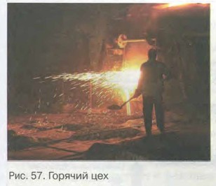 Хозяйство России § 20. Металлургический комплекс: чёрная металлургия РоссииВспомните 1. что такое коксующийся уголь? 2. в чём заключается принцип маятника в металлургии? В природе существует несколько десятков металлов, которые человек использует в разных хозяйственных целях. Производство этих металлов обеспечивают две отрасли — чёрная и цветная металлургия. Значение чёрной металлургии РоссииЧёрная металлургия на основе железных руд и других материалов производит два самых нужных в хозяйстве сплава — чугун и сталь. Сами мы, конечно, редко покупаем в магазине сталь или чугун, но пользуемся ими в составе других товаров. С использованием этих металлов строят дома, производят автомобили, велосипеды, корабли, изготавливают инструменты. Чёрная металлургия — одна из важнейших отраслей хозяйственного комплекса России. Продукция металлургических предприятий служит фундаментом для развития многих других отраслей промышленности. По производству чёрных металлов Россия занимает четвёртое место в мире. Особенности чёрной металлургии РоссииПредприятия чёрной металлургии используют огромные объёмы сырья. Сырьём для этих предприятий являются железная и марганцевая руды, каменный уголь, причём не любой, а только коксующийся. Марганца нужно относительно мало, поэтому большинство предприятий отрасли расположены в районах добычи коксующегося угля или железной руды. Необходимо также очень много воды. Переработка большого количества сырья приводит к образованию твёрдых, жидких и газообразных отходов. Поэтому чёрную металлургию относят к числу наиболее «грязных» отраслей хозяйства. Работа на металлургических заводах (особенно в так называемых горячих цехах, где, собственно, выплавляется металл) тяжела и даже вредна для здоровья. Несмотря на достаточную степень автоматизации технологического процесса, полностью заменить человека на производстве не удаётся (рис. 57).