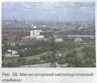 Чёрную металлургию России отличает высокий уровень концентрации и комбинирования производства. Концентрацией называется сосредоточение производства какой-либо продукции на крупных предприятиях (рис. 58). В данном случае это означает, что металлургические предприятия, как правило, очень велики по объёму использованного сырья, численности рабочих, количеству выпускаемой продукции.