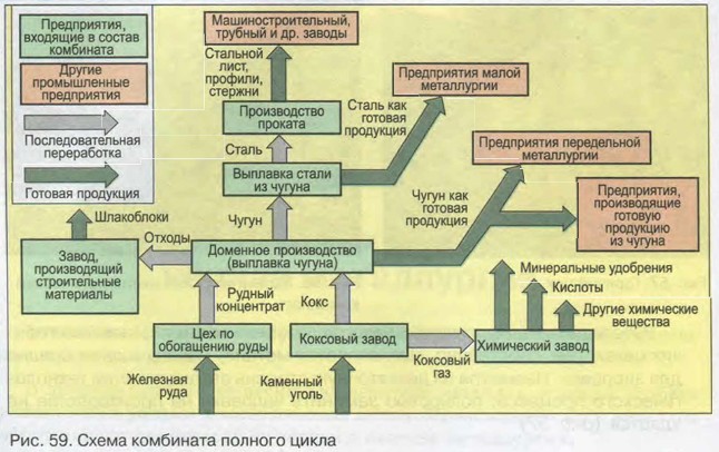 С одной стороны, это хорошо, т.к. чем крупнее предприятие, тем дешевле выпускаемая продукция. Но с другой стороны, чрезмерная концентрация производства имеет и негативные последствия. Во-первых, сильно увеличиваются затраты на перевозку готовой продукции, ведь металл требуется везде. В России, с её огромной территорией, затраты на транспорт особенно велики. Каждая десятая тонна грузов, перевозимых железными дорогами, это чёрные металлы. Во-вторых, не будем забывать, что металлургические производства относятся к числу «грязных». Крупные предприятия оказывают сильное воздействие на природу. Наконец, крупным заводам труднее приспособиться ко всё время меняющимся требованиям потребителей металла, а также усовершенствовать технологию. Внимательный читатель учебника вправе воскликнуть: «Так что же лучше — заводы-гиганты или карлики?» Самое лучшее — это сочетание! Экономическая география для того и нужна, чтобы правильно посчитать, какое именно сочетание заводов разного размера, а также различной специализации будет самым подходящим в данном месте — городе, районе,стране. Комбинирование — сочетание производств, основанное на последовательной обработке сырья, комплексном использовании сырья и утилизации отходов. Если такое сочетание производств организовано на одном предприятии, оно называется комбинатом. В состав металлургических комбинатов, помимо собственно металлургических производств, входят коксовые заводы, производство многочисленных химических продуктов, строительных материалов и т.д. Стержнем комбината является металлургический передел, т.е. производство из руды чугуна, выплавка из чугуна стали и производство из стальных болванок проката (листовой стали, труб и др.). Предприятие, которое выпускает и чугун, и сталь, и прокат, называется комбинатом полного цикла (рис. 59).
