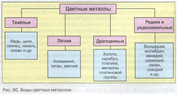 Хозяйство России § 21. Металлургический комплекс: цветная металлургия РоссииВспомните В каких крупных природных районах страны есть месторождения разнообразных руд? Особенности цветной металлургии РоссииГоворят, если чёрная металлургия даёт промышленности «хлеб», то цветная обеспечивает её «маслом». Суммарная выплавка всех цветных металлов (а их в стране производится около 70; рис. 60) в десятки раз меньше, чем выплавка стали. Но использование в хозяйстве цветных металлов облагораживает структуру экономики, делает её более прогрессивной. Без цветных металлов невозможен выпуск высококачественной стали и полупроводников. Необходимы они для производства космической техники, катализаторов для химической индустрии, автомобильных фильтров для очистки выхлопных газов, покрытий для сверхъёмких дисков магнитной памяти и других видов продукции в сфере новейших технологий.