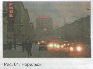 Роль России особенно велика в мировом производстве алюминия, никеля, меди, титана, олова и золота. Руды цветных металлов отличаются низким содержанием металла. Сравните: среднего качества железная руда содержит 30—40% железа (богатая — 60—70%), а медная руда считается очень богатой, если в ней меди около 5%. В молибденовой руде содержится всего несколько сотых долей процента молибдена! Другая особенность руд цветных металлов — их многокомпонентный состав, т.е. они содержат несколько разных металлов. Например, в уральской так называемой «медной» руде содержатся также никель, цинк, хром, другие металлы и неметаллы — сера. В связи с этим производство цинка и меди сопровождается выделением отходов — сернистого газа. Он может являться основой для изготовления серной кислоты. Благодаря сложному составу руд цветная металлургия «притягивает» к себе другие отрасли промышленности. Факторы размещения цветной металлургии РоссииРазмещение цветной металлургии тяготеет к источникам сырья, топлива и энергии. Ввиду низкого содержания металла в рудах их первичная переработка (т.е. обогащение) жёстко привязана к районам добычи сырья. А вот следующие стадии металлургического передела в основном ориентируются на топливные базы (производство никеля и цинка) или дешёвую электроэнергию (производство алюминия, магния, титана). Это, впрочем, только «общая схема» размещения, а жизнь, как известно, гораздо богаче любых схем. Сырьё, топливо и энергия неодинаково влияют на размещение разных предприятий отрасли. Так, выплавка черновой меди (которая ещё содержит примеси) происходит в сырьевых районах и районах, богатых топливом. Заключительная же стадия — рафинирование меди (т.е. её очистка) — может располагаться и в районах потребления. В алюминиевой промышленности на первой стадии из алюминиевых руд (бокситов или нефелинов) производится концентрат. Он называется глинозём и является чистым окислом алюминия. На второй стадии производства в электропечах происходит восстановление алюминия из окисла при высокой температуре. Производство глинозёма, будучи материалоёмким, тяготеет к местам добычи алюминиевых руд, а чрезвычайно энергоёмкая выплавка металлического алюминия — к дешёвой электроэнергии. Если для производства 1 т стали на электрометаллургическом заводе необходимо затратить 9 000 кВт-ч электроэнергии, то для выплавки 1 т алюминия — уже 18 000, а 1 т титана — даже 50 000 кВт-ч! Размещение отраслей цветной металлургии РоссииМедная промышленность возникла в России на Урале. За почти 300 лет сильной эксплуатации многие месторождения руд здесь истощились. Ныне уральские медеплавильные заводы используют как местное, так и привозное (в основном казахстанское) сырьё. Крупнейший центр медно-никелевого производства — Норильск (рис. 61) был создан в Восточной Сибири в 1930-е гг. Комбинат в этом заполярном городе даёт около половины российской меди, 1/3 никеля, почти всю платину, а также золото, кобальт и другие металлы. Деятельность этого гиганта цветной металлургии, увы, далеко не полезна для жителей города и окружающей природы. Комбинат — крупнейший в России загрязнитель атмосферы, прежде всего двуокисью серы.