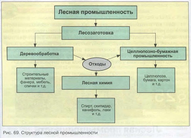 Хозяйство России § 25. Лесная промышленность РоссииВспомните 1. Какие породы деревьев преобладают в лесах России? 2. Где расположены крупнейшие лесные массивы нашей страны? Особенности лесной промышленности РоссииЛесная промышленность — традиционная для России отрасль специализации хозяйства. Она ориентирована на отечественного и зарубежного потребителя. Российский лес с успехом продавался в Европу ещё несколько веков назад. Венеция... Название этого города, построенного на мелководье Венецианского залива, многие улицы которого являются каналами, известно каждому. Менее известен тот факт, что сваи, которые забивались в морское дно и на которых были построены дома этого удивительного города, изготовлены из сибирской лиственницы, древесина которой не гниёт в воде. Много веков сваи из российской древесины исправно служат этому городу. Отрасль опирается на богатейшие лесные ресурсы страны. Лесом занята почти половина территории России (7,7 млн км2). Нашей стране принадлежит почти пятая часть мировых запасов древесины. В их составе преобладают хвойные породы (более 80%). Их древесина ценится выше, чем древесина лиственных пород деревьев. Дело в том, что древесина хвойных деревьев, как правило, плотнее. Лесные ресурсы распределены по территории страны крайне неравномерно, что связано с зональным изменением климатических условий. Большая часть лесов сосредоточена в лесоизбыточных районах: Северном, Волго-Вятском, Уральском, Западно-Сибирском, Восточно-Сибирском и Дальневосточном. Отрасли лесной промышленности РоссииЛесная промышленность объединяет все производства, связанные с заготовкой, обработкой и химической переработкой древесного сырья. В её состав входят примерно 20 видов производств, главными из которых являются лесозаготовка, деревообработка, целлюлозно-бумажная промышленность и лесная химия (рис. 69).