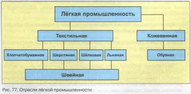 Ведущая отрасль лёгкой промышленности — текстильная (рис. 78). В ней занято наибольшее число работников, а объём выпускаемой продукции особенно велик. Текстильная промышленность выпускает льняные, хлопчатобумажные, шёлковые, шерстяные и синтетические ткани.