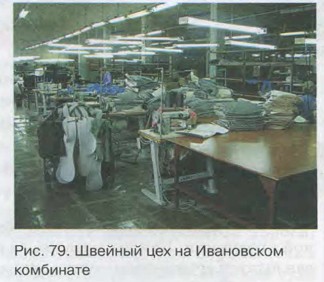 Главный район производства тканей исторически сложился в центре Европейской России. До сих пор 75% всех выпускаемых в стране тканей приходится на долю Центрального экономического района. Текстильная промышленность здесь использует как собственное (лён, химические волокна), так и привозное (хлопок, шёлк, шерсть) сырьё. Привозное сырьё поставляется преимущественно из Узбекистана, Казахстана и Азербайджана. Более половины тканей России выпускается в Ивановской области. Догадайтесь: почему Иваново называют «городом невест»? Среди других экономических районов страны развитой текстильной промышленностью отличаются: Поволжский, Западно-Сибирский, Уральский. Текстильные фабрики часто размещаются в центрах развития металлургии и горнодобывающей промышленности. Почему? На предприятиях тяжёлой промышленности занята мужская часть населения. Обеспечить работой женскую часть могут именно текстильные фабрики, так как предприятия лёгкой промышленности традиционно используют в основном женский труд. Так удаётся максимально использовать имеющиеся трудовые ресурсы. Теперь понятно, почему Иваново — «город невест»? Кстати, чтобы сократить в нём дефицит женихов, здесь разместили крупный станкостроительный завод. Швейная промышленность производит готовую одежду (рис. 79). Она является второй отраслью лёгкой промышленности по объёму выпускаемой продукции. Предприятия этой отрасли распространены повсеместно. Они работают во всех экономических районах страны, хотя наибольшее число этих предприятий находится в Центральном и Северо-Западном экономических районах. Предприятия этих районов выпускают около трети всей продукции отрасли.