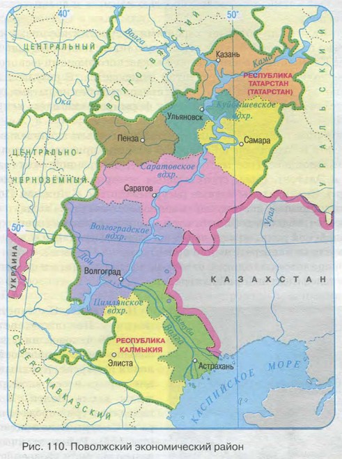 Экономические районы России § 39. Поволжский районВспомните Какие условия необходимы для выращивания озимой пшеницы, а какие — для яровой? Общие сведения Поволжского районаВ состав экономического района входят Астраханская, Волгоградская, Пензенская, Самарская, Саратовская, Ульяновская области, республики Татарстан и Калмыкия (рис. 110). На 3,1% площади страны (536 тыс. км2) проживает 11,6% её населения (около 16 млн человек). Регион специализируется на транспортном и сельскохозяйственном машиностроении, нефтяной, газодобывающей, химической и пищевой промышленности, электроэнергетике, производстве зерновых, технических, овощных и бахчевых культур.