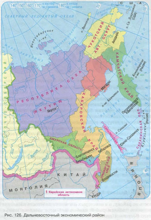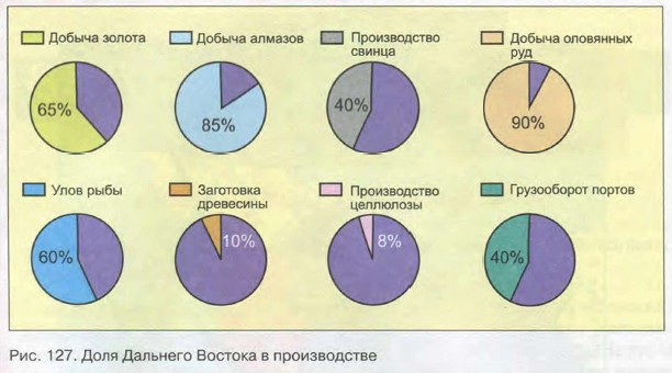 Экономические районы России § 43. Дальневосточный районВспомните 1. Что отличает климат Дальнего Востока? 2. Где находится полюс холода Северного полушария? Общие сведения Дальневосточного районаЭтот экономический район включает Приморский, Хабаровский и Камчатский края, Еврейскую АО, Амурскую, Магаданскую и Сахалинскую области, Чукотский АО, Республику Саха (Якутия) (рис. 126). Он занимает гигантскую территорию — 6,2 млн км2, что составляет 36,2% территории России. Численность же населения здесь относительно мала (6,5 млн человек) — 4,5% населения страны. Экономика района представлена горнорудной (добыча золота, олова и алмазов), пищевой (рыбная и рыбоконсервная) и лесной промышленностью (рис. 127).