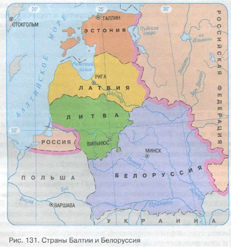 Страны ближнего зарубежья § 44. Страны Балтии и БелоруссияВспомните 1. К какому океану относится Балтийское море? 2. каким образом Балтийское море связано с Мировым океаном? Страны Балтии после выхода из состава СССР в политической и хозяйственной жизни ориентируются на Западную Европу. В настоящее время они являются членами Европейского Союза и входят в число стран — участниц НАТО. Белоруссия же не только входит в Содружество Независимых Государств (СНГ), но и заключила с Россией договор о создании единого союзного государства (рис. 131).