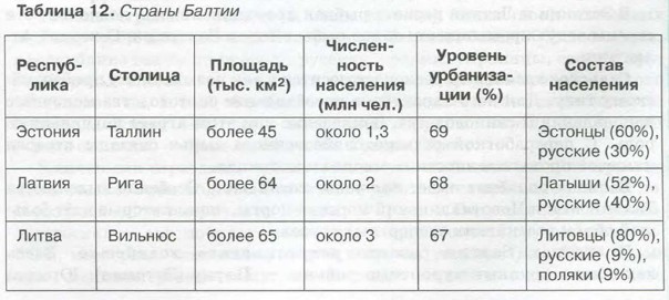 Страны Балтии и Белоруссию сближает транзитное положение между территорией России и остальной Европой, они имеют сходную специализацию сельского хозяйства, некоторое сходство в структуре отраслей промышленности . Страны БалтииВсе три республики невелики по площади, особенно Эстония — самая маленькая страна ближнего зарубежья (табл. 12). Столицами Эстонии, Латвии и Литвы являются соответственно Таллин, Рига и Вильнюс. Общее население стран Балтии превышает 7 млн человек. Плотность населения колеблется от 29 (Эстония) до 46 человек на 1 км2 (Литва).