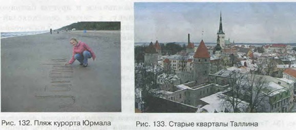 Территория всех стран отличается в основном плоским равнинным рельефом, который в сочетании с умеренно-континентальным, достаточно влажным климатом способствует развитию сельского хозяйства. Однако не слишком плодородные дерново-подзолистые почвы ограничивают возможности земледелия. Почвы, особенно в Литве, каменистые — валуны принесены сюда древним оледенением. Для всех трёх стран характерна крайняя бедность минеральных ресурсов. Только в Эстонии имеются запасы фосфоритов и горючих сланцев. Из всех стран наиболее значительными гидроэнергетическими ресурсами располагает Латвия, где на реке Даугаве, крупнейшей в Латвии, построен каскад ГЭС. Все страны Балтии обладают значительными рекреационными ресурсами. Правда, Балтийское море сравнительно холодное, но его прекрасные песчаные пляжи, сосновые леса пользуются популярностью. Притом что численность населения стран Балтии очень невелика, его состав довольно неоднороден. В Латвии и Эстонии велика доля русского населения. В Литве литовцы составляют подавляющее большинство населения, но и эту страну нельзя считать однонациональной. Эстонцы относятся к финно-угорской группе уральской языковой семьи, как и финны, а также народы России — карелы, марийцы, коми, мордва и др. Латыши и литовцы относятся к балтийской группе индоевропейской семьи. Их языки не похожи ни на какие другие, так как эту группу образуют только два языка — латышский и литовский. Ключевыми отраслями хозяйства стран Балтии является неметаллоёмкое машиностроение и лёгкая (текстильная) промышленность. В Эстонии на собственном сырье развита химическая промышленность (переработка сланцев и производство фосфорных удобрений). Наиболее промышленно развитой прибалтийской республикой является Латвия. Главная отрасль её промышленности — транспортное машиностроение (автомобиле-, судо- и вагоностроение), развито производство химических волокон и минеральных удобрений. В Литве производят сложные станки, бытовую технику (телевизоры), на привозном сырье работает единственный в Прибалтике нефтеперерабатывающий завод (Мажейкяй). В Эстонии и Латвии развита рыбная промышленность, поскольку эти страны ведут промышленный лов рыбы в водах Балтики и Северной Атлантики. Сельское хозяйство региона относится к так называемому прибалтийскому типу. Для него характерно преобладание скотоводства молочного направления и свиноводства. Земледелие при этом играет подчинённую роль. С переработкой сельскохозяйственного сырья связаны отрасли пищевой промышленности — мясная и молочная. Большое значение имеет портовое хозяйство. Особенно выделяются Таллинский и Новоталлинский морские порты, через которые идёт большой объём российских экспортных грузов. В странах Балтии развито рекреационное хозяйство. Здесь находятся крупные курортные районы — Пярну (Эстония), Юрмала (Латвия) (рис. 132) и Паланга (Литва), которые привлекают многочисленных отдыхающих — в основном из России. Туристическими объектами являются старинные города Прибалтики (рис. 133).