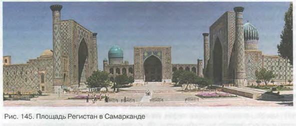 Страны ближнего зарубежья Страны Центрально-Азиатского регионаТуркменистан, Узбекистан, Киргизия, ТаджикистанПриродные условия всех этих государств во многом схожи. Они расположены в условиях континентального сухого климата, для которого характерны достаточно холодная зима и продолжительное жаркое лето. Во всех странах выделяются равнинная, предгорная и горная части. На равнинах сказывается недостаток влаги, и обширные территории заняты пустынями. Особенно высока доля пустынь в Туркменистане, где они занимают 90% территории страны. Но на поливных землях здесь можно выращивать многие теплолюбивые культуры. Предгорные районы не испытывают трудностей с водой — здесь много рек, берущих начало в горах. Самыми горными странами являются Таджикистан и Киргизия. Большая часть территории первой из них расположена в высокогорьях Памира, а второй — в горах Тянь-Шаня. Часть природных земель освоена человеком многие тысячи лет тому назад; в древних городах немало памятников архитектуры (рис. 145).