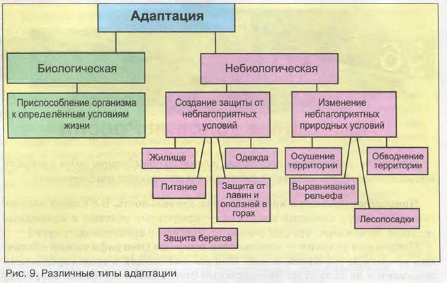 Россия на карте мира. Природные условия и ресурсы России § 6. Природные условия РоссииВспомните 1. Как влияют природные условия на повседневную жизнь и хозяйственную деятельность человека? 2. Какие условия называются комфортными? Природные условия и хозяйственная деятельностьВ 8 классе мы уже говорили о двух похожих понятиях — природные условия и природные ресурсы. Вспомним, что они означают. Начнём с природных условий. Природные условия — особенности природы (географической оболочки), влияющие на жизнь людей. Под жизнью людей в этом определении понимается не только их повседневный быт, отдых, состояние здоровья, но и трудовая деятельность, работа. Различают прямое и косвенное влияние природных условий на жизнь человека. Прямое воздействие связано с непосредственным влиянием этих условий (температуры воздуха, влажности, продолжительности светового дня, атмосферного давления) на здоровье. Косвенное воздействие природных условий проявляется в особенностях питания, одежды, конструкции жилищ, возможностях для организации отдыха людей. Природные условия оказывают существенное влияние на разные стороны хозяйственной деятельности. Они облегчают или затрудняют заселение и освоение территории. Например, разработку полезных ископаемых экономичнее и проще вести в районах с благоприятными природными условиями. Стоимость строительства во многом зависит от прочности грунтов, степени заболоченности территории, наличия многолетней мерзлоты и характера рельефа. Приспособление человека к природным условиямРасселение людей на поверхности суши всегда было связано с природными условиями. Поэтому прежде всего были заселены приморские и приречные низменности, находящиеся в условиях субтропического климата. Однако, развиваясь и расселяясь по планете, человечество занимало всё новые пространства, которые отличались менее комфортными природными условиями. Оно было вынуждено адаптироваться к менее благоприятным условиям климата, рельефа и т.п. Возможно, вы ещё помните, что такое адаптация? Давайте повторим. Адаптация (от лат. adaptatio — приспособление) — процесс приспособления человека к различным условиям окружающей среды. Существуют два способа адаптации: биологический и небиологический (рис. 9). Биологическая адаптация происходит за счёт возможностей человеческого организма, небиологическая основана на использовании достижений цивилизации. В процессе небиологической адаптации человек старается изолироваться от влияния неблагоприятных условий. Идеальную изоляцию от крайне неблагоприятных условий удалось достичь даже при освоении космического пространства. Орбитальная станция и скафандры полностью изолируют человека от агрессивного воздействия космической среды (рис. 10). На Земле не нужно стремиться к такой изоляции, но ограничить косвенное влияние природных условий иногда вполне возможно и необходимо. Создание жилищ и одежды, отвечающих определённым природным условиям, является примером подобного приспособления (рис. 11).