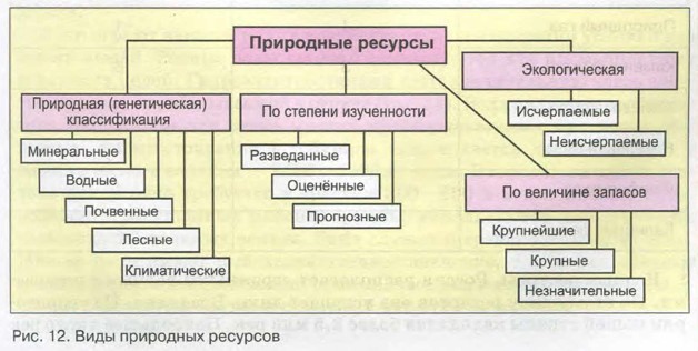 Россия на карте мира. Природные условия и ресурсы России § 7. Природные ресурсы РоссииВспомните Что вы узнали о природных ресурсах России в прошлом учебном году? Природные ресурсы РоссииОчевидно, что хозяйственная деятельность сильнейшим образом зависит от наличия природных ресурсов. Вспомним определение понятия «природные ресурсы», которое давалось в прошлом году. Природные ресурсы — это все компоненты природы, которые используются или могут быть использованы человеком в хозяйственных целях. Существует много классификаций природных ресурсов (рис. 12). Мы будем пользоваться самой простой из них — природной, или генетической, классификацией.