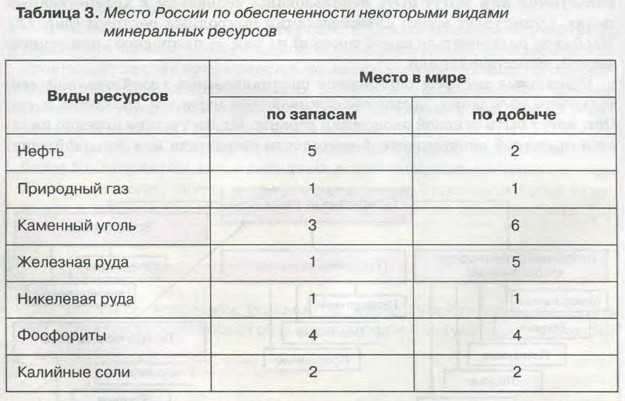 Природные ресурсы определяют специализацию хозяйственной деятельности населения, состав обслуживающих отраслей хозяйства и т.п. Они могут быть основой экономики страны. Их отсутствие нередко является причиной экономической отсталости государств или большой зависимости их хозяйства от поставщиков, в частности руды, угля, нефти, энергии и т.п. Но это России не грозит: по запасам и разнообразию природных ресурсов наша страна — одна из богатейших в мире. Минеральные ресурсы РоссииПо запасам и добыче многих видов полезных ископаемых Россия занимает лидирующее положение в мире (табл. 3). Из недр России извлекается около 12% нефти, около 28% природного газа, 12% каменного угля, 13% железной руды, 10—12% цветных металлов, 55% апатитов, 16% калийных солей от общемировой добычи этих полезных ископаемых. Существенна роль России в мировой добыче золота, серебра, платины и металлов платиновой группы, а также алмазов. Обеспеченность нашей страны топливными полезными ископаемыми лучше по сравнению с запасами рудных полезных ископаемых. Размещение месторождений полезных ископаемых тесно связано с геологической историей развития территории страны и существенно влияет на развитие отраслей промышленности в разных её районах.