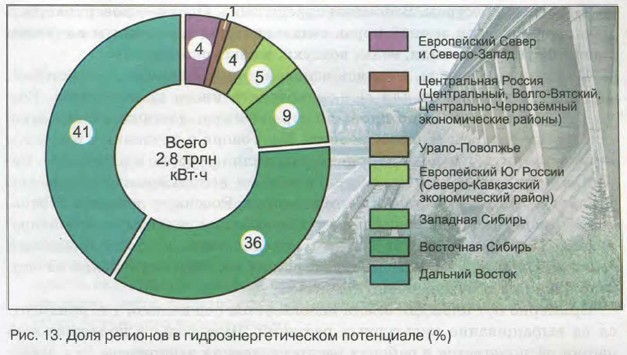 Водные ресурсы РоссииРоссия располагает огромными водными ресурсами. По этому виду ресурсов она уступает лишь Бразилии. На территории нашей страны находится более 2,5 млн рек. Наибольшее число рек впадает в Северный Ледовитый океан. Крупнейшими из них являются Енисей, Лена, Обь, Печора, Северная Двина, Индигирка, Яна, Колыма. Енисей и Лена — наиболее полноводные реки страны. Водные ресурсы страны в основном формируются в пределах её территории. Только 5% речных вод поступает в Россию с территорий соседних государств. Реки играют важную роль в хозяйстве страны и создании условий для жизни людей. Речные воды широко используются для промышленных и бытовых целей. Гидроэлектростанции дают значительную часть электроэнергии, вырабатываемой в стране (рис. 13). Вода является необходимым материалом для очень многих производственных процессов. Например, на изготовление 1 т бумаги затрачивается до 200 м3, а 1 т синтетического волокна — 2500—5000 м3 воды. В городах на одного жителя ежесуточно требуется в среднем 300—600 л воды. Речные воды, особенно в засушливых районах страны, используются для орошения сельскохозяйственных земель. Реки служат и транспортными путями. Многие реки имеют рыбохозяйственное значение, т.к. в них обитают ценные породы рыб, имеющие промысловое значение. Отдых у реки — самый распространённый и приятный вид отдыха россиян.