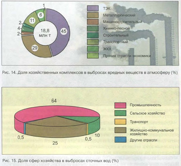 Россия на карте мира. Природные условия и ресурсы России § 8. Хозяйственная деятельность и изменение природной среды РоссииВспомните Что такое экология и экологические проблемы? Взаимодействие природы и человекаИзучение географии в 8 классе мы завершили темой о взаимном влиянии природы и человека. Мы установили, что на природу влияет не столько сам человек, сколько его хозяйственная деятельность. Самое мощное воздействие на природный комплекс в целом и на его компоненты оказывают различные отрасли промышленности. Это связано с тем, что они используют разнообразные природные ресурсы: полезные ископаемые, воду, древесину и т.д. Но то, что мы называем природными ресурсами, это ещё и часть природно-территориальных комплексов. Их разработка неминуемо должна изменить облик этих комплексов. Промышленные предприятия в процессе своей работы производят немало отходов: твёрдых, жидких, газообразных (рис. 14, 15). Они также поступают в природный комплекс и разрушают его. Особенно опасны газообразные отходы, загрязняющие атмосферу, и жидкие стоки, изменяющие химический состав воды. Существенное влияние на природу оказывает и сельское хозяйство (см. рис. 15). В современном сельском хозяйстве широко используются разнообразные химические вещества — минеральные удобрения, препараты для борьбы с сорняками и вредными для растений насекомыми. Поступление этих веществ в окружающую природу в максимальной степени отражается на загрязнении водных объектов. Состояние природной среды также зависит от работы транспорта. Наибольшее влияние на химический состав воздуха, поверхностных вод, почвенного покрова оказывают виды транспорта, которые работают за счёт сжигания топлива: бензина, угля, мазута, дизельного топлива. В процессе сжигания топлива в воздух поступают выхлопные газы, которые в дальнейшем приводят к изменению природной среды.