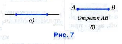 Прямую, на которой отмечены две точки, например А и В, иногда обозначают двумя буквами: АВ или ВА. Для краткости вместо слов «точка А лежит на прямой а» используют запись А ∈ а, а вместо слов «точка В не лежит на прямой а» — запись В ∉ а. На рисунке 7, а выделена часть прямой, ограниченная двумя точками. Такая часть прямой называется отрезком. Точки, ограничивающие отрезок, называются его концами. На рисунке 7, б изображён отрезок с концами А и В. Такой отрезок обозначается АВ или В А. Отрезок АВ содержит точки А и В и все точки прямой АВ, лежащие между А и В.