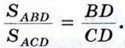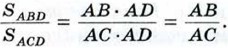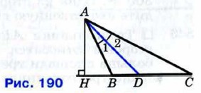 Пусть AD — биссектриса треугольника АВС. Докажем, что (рис. 190). Треугольники ABD и ACD имеют общую высоту АН, поэтому С другой стороны, эти же треугольники имеют по равному углу (∠1 = ∠2), поэтому Из двух равенств для отношения площадеи получаем или что и требовалось доказать.