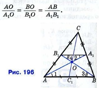 Треугольники BMN и ВАС подобны по второму признаку подобия треугольников (∠B — общий Пользуясь этой теоремой, решим следующую задачу: Задача 1 Доказать, что медианы треугольника пересекаются в одной точке, которая делит каждую медиану в отношении 2 : 1, считая от вершины. Решение Рассмотрим произвольный треугольник АВС. Обозначим буквой О точку пересечения его медиан АА1 и ВВ1 и проведём среднюю линию А1В1 этого треугольника (рис. 196). Отрезок А1В1 параллелен стороне АВ, поэтому углы 1 и 2, а также углы 3 и 4 равны как накрест лежащие углы при пересечении параллельных прямых АВ и А1В1 секущими АА1 и ВВ1. Следовательно, треугольники АОВ и А1ОВ1 подобны по двум углам, и, значит, их стороны пропорциональны: