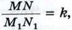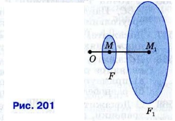 § 3. Применение подобия к доказательству теорем и решению задач О подобии произвольных фигурПонятие подобия можно ввести не только для треугольников, но и для произвольных фигур. Фигуры F и F1 называются подобными, если каждой точке фигуры F можно сопоставить точку фигуры F1 так, что для любых двух точек М и N фигуры F и сопоставленных им точек М1 и N1 фигуры F1 выполняется равенство Сопоставление точек подобных фигур хорошо знакомо нам из повседневного опыта. Так, при проектировании киноленты на экран каждой точке изображения на кинокадре сопоставляется точка на экране, причём все расстояния увеличиваются в одинаковое число раз. На рисунке 201 представлен способ построения фигуры F1, подобной данной фигуре F. Каждой точке М фигуры F сопоставляется точка М1 плоскости так, что точки М и М1 лежат на луче с началом в некоторой фиксированной точке О, причём ОМ = k • ОМ1 (на рисунке 201