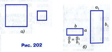 В результате такого сопоставления получается фигура F1, подобная фигуре F. В этом случае фигуры F и F1 называются центрально-подобными, а само описанное сопоставление называется центральным подобием или гомотетией. Можно доказать, что для треугольников общее определение подобия равносильно определению, данному в п. 59. Примерами подобных четырёхугольников являются любые два квадрата (рис. 202, а), а также два прямоугольника, у которых две смежные стороны одного пропорциональны двум смежным сторонам другого (рис. 202, б). Примерами подобных фигур произвольной формы являются две географические карты одного и того же района, выполненные в разных масштабах, а также фотографии одного и того же предмета, сделанные в разных увеличениях.