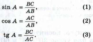Синусом острого угла прямоугольного треугольника называется отношение противолежащего катета к гипотенузе. Косинусом острого угла прямоугольного треугольника называется отношение прилежащего катета к гипотенузе. Тангенсом острого угла прямоугольного треугольника называется отношение противолежащего катета к прилежащему катету. Синус, косинус и тангенс угла, равного а, обозначаются символами sin α, cos α и tg α (читается: «синус альфа», «косинус альфа» и «тангенс альфа»). На рисунке 206