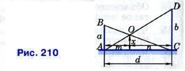 Глава VII. Подобные треугольники Дополнительные задачи к главе VII604. 605. Диагональ АС трапеции ABCD делит её на два подобных треугольника. Докажите, что АС2 = а • b, где а и b — основания трапеции. 606. 607. 608. На продолжении боковой стороны ОВ равнобедренного треугольника АО В с основанием АВ взята точка С так, что точка В лежит между точками О и С. Отрезок АС пересекает биссектрису угла АОВ в точке М. Докажите, что AM < МС. 609. На стороне ВС треугольника АВС взята точка D так, что 610. Прямая, параллельная стороне АВ треугольника АВС, делит сторону АС в отношении 2 : 7, считая от вершины А. Найдите стороны отсечённого треугольника, если АВ = 10см, ВС = 18 см, СА = 21,6 см. 611. Докажите, что медиана AM треугольника АВС делит пополам любой отрезок, параллельный стороне ВС, концы которого лежат на сторонах АВ и АС. 612. Два шеста АВ и CD разной длины а и b установлены вертикально на некотором расстоянии друг от друга так, как показано на рисунке 210. Концы А и D, В и С соединены верёвками, которые пересекаются в точке О. По данным рисунка докажите, что: