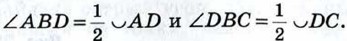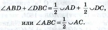 Отсюда следует, что 2∠1 = 2) Луч ВО делит угол АВС на два угла. В этом случае луч ВО пересекает дугу АС в некоторой точке D (рис. 218, б). Точка D разделяет дугу АС на две дуги:
