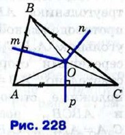 Для доказательства этого утверждения рассмотрим серединные перпендикуляры m и n к сторонам АВ и ВС треугольника АВС (рис. 228). Эти прямые пересекаются в некоторой точке О. В самом деле, если предположить противное, т. е. что m || n, то прямая ВА, будучи перпендикулярной к прямой m, была бы перпендикулярна и к параллельной ей прямой n, а тогда через точку В проходили бы две прямые ВА и ВС, перпендикулярные к прямой n, что невозможно.