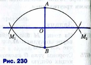 § 3. Четыре замечательные точки треугольника Задачи к § 3. Четыре замечательные точки треугольника (окончание)686. Решение Пусть АВ — данный отрезок. Построим две окружности с центрами в точках А и В радиуса АВ (рис. 230). Эти окружности пересекаются в двух точках М1 и М2. Отрезки АМ1, AM2, ВМ1, ВМ2 равны друг другу как радиусы этих окружностей.