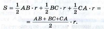 § 4. Вписанная и описанная окружности Вписанная окружность (окончание)Замечание 2 Обратимся к рисунку 232. Мы видим, что треугольник АВС составлен из трёх треугольников: ABO, ВСО и САО. Если в каждом из этих треугольников принять за основание сторону треугольника АВС, то высотой окажется радиус r окружности, вписанной в треугольник АВС. Поэтому площадь S треугольника АВС выражается формулой