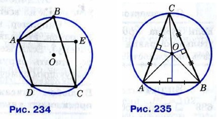 § 4. Вписанная и описанная окружности Описанная окружностьЕсли все вершины многоугольника лежат на окружности, то окружность называется описанной около многоугольника, а многоугольник — вписанным в эту окружность. На рисунке 234 четырёхугольник ABCD вписан в окружность с центром О, а четырёхугольник AECD не является вписанным в эту окружность, так как вершина Е не лежит на окружности. Треугольник АВС на рисунке 235 является впи- рИс. 234 санным в окружность с центром О.
