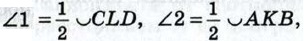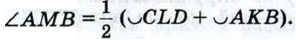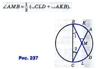 Решение Проведём хорду ВС. Так как ∠AMB — внешний угол треугольника ВМС, то ∠AMB = ∠1 + ∠2. По теореме о вписанном угле 719. Через точку, лежащую вне окружности, проведены две секущие. Докажите, что угол между ними измеряется полуразностью дуг, заключённых внутри угла. 720. Может ли вершина разностороннего треугольника лежать на серединном перпендикуляре к какой-либо стороне? Ответ обоснуйте. 721. Докажите, что если в прямоугольник можно вписать окружность, то этот прямоугольник — квадрат. 722. Четырёхугольник ABCD описан около окружности радиуса г. Известно, что АВ : CD = 2 : 3, AD : ВС = 2 : 1. Найдите стороны четырёхугольника, если его площадь равна S. 723. Докажите, что если прямые, содержащие основания трапеции, касаются окружности, то прямая, проходящая через середины боковых сторон трапеции, проходит через центр этой окружности.