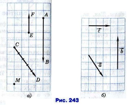 Для дальнейшего целесообразно условиться, что любая точка плоскости также является вектором. В этом случае вектор называется нулевым. Начало нулевого вектора совпадает с его концом. На рисунке такой вектор изображается одной точкой. Если, например, точка, изображающая нулевой вектор, обозначена буквой М, то данный нулевой вектор можно обозначить так: Длиной или модулем ненулевого вектора Длины векторов, изображённых на рисунках 243, а и 243, 6, таковы: