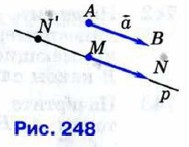 В самом деле, если — нулевой вектор, то искомым вектором является вектор Допустим, что вектор ненулевой, а точки А и B — его начало и конец. Проведём через точку M прямую р, параллельную АВ (рис. 248; если M — точка прямой АВ, то в качестве прямой р возьмём саму прямую АВ). На прямой р отложим отрезки MN и MN', равные отрезку АВ, и выберем из векторов тот, который сонаправлен с вектором (на рисунке 248 вектор ). Этот вектор и является искомым вектором, равным вектору . Из построения следует, что такой вектор только один.