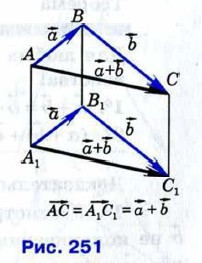 Докажем, что если при сложении векторов и точку А, от которой откладывается вектор заменить другой точкой А1 то вектор заменится равным ему вектором Иными словами, докажем, что если и то (рис. 251).