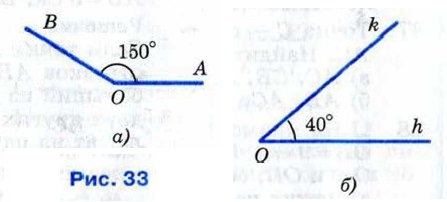 На рисунке 33, а изображён угол АОВ, градусная мера которого равна 150°. Обычно говорят кратко: «Угол АОВ равен 150°» — и пишут: ∠AOB = 150°. На рисунке 33, б угол hk равен 40° (∠hk = 40°). Определённые части градуса носят специальные названия: