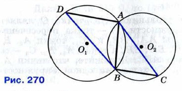 Глава VIII. Окружность Задачи повышенной трудности к главе VIII. Окружность877. Две окружности имеют единственную общую точку М. Через эту точку проведены две секущие, пересекающие одну окружность в точках А и A1, а другую — в точках В и В1. Докажите, что АА1 || ВВ1. 878. Прямая АС — касательная к окружности с центром O1, а прямая BD — касательная к окружности с центром О2 (рис. 270). Докажите, что: а) AD || ВС;