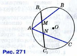 879. Точки В1 и С1 — середины дуг АВ и АС (рис. 271). Докажите, что AM = AN.