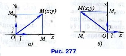 Вектор назовём радиус-вектором точки М. Докажем, что координаты точки М равны соответствующим координатам её радиус-вектора. Воспользуемся равенством (см. рис. 277) и докажем, что Если x > 0 (как на рисунке 277, а), то х = ОМ1, а векторы и сонаправлены. Поэтому Если х < 0 (как на рисунке 277,6), то а векторы и противоположно направлены. Поэтому Наконец, если х = 0, то и равенство в этом случае также справедливо. Таким образом, в любом случае Аналогично доказывается, что