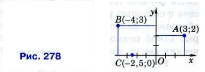 Аналогично определяется число у (ордината точки М). На рисунке 278 изображена прямоугольная система координат Оху и отмечены точки А (3; 2), В (-4; 3), С (-2,5; 0).