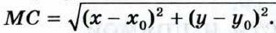 § 3. Уравнения окружности и прямой Уравнение окружностиВыведем уравнение окружности радиуса г с центром С в заданной прямоугольной системе координат. Пусть точка С имеет координаты (x0; у0) (рис. 286). Расстояние от произвольной точки М (х; у) до точки С вычисляется по формуле (х - х0)2 + (у - у0)2 = r2. (1) Если же точка М (х; у) не лежит на данной окружности, то МС2 ≠ r2, и, значит, координаты точки М не удовлетворяют уравнению (1). Следовательно, в прямоугольной системе координат уравнение окружности радиуса r с центром в точке С (х0; у0) имеет вид: (х - х1)2 + (у - у0)2 = r2. В частности, уравнение окружности радиуса r с центром в начале координат имеет вид: х2 + у2 = r2. Задача Найти уравнение окружности с центром в точке (-3; 4), проходящей через начало координат. Решение Центр окружности имеет координаты (-3; 4). Поэтому уравнение этой окружности можно записать в виде (х + 3)2 + (у - 4)2 = r2, где r — пока неизвестный радиус окружности. Найдём его. Для этого воспользуемся тем, что окружность проходит через начало координат, т. е. координаты точки О (0; 0) удовлетворяют этому уравнению: (0 + 3)2 + (0 - 4)2 = r2. Отсюда r2 = 25, и, значит, r = 5. Итак, искомое уравнение окружности имеет вид (х + 3)2 + (у - 4)2 = 25. Если раскрыть скобки и привести подобные члены, то получится уравнение х2 + у2 + 6х - 8у = 0, которое также является уравнением данной окружности.
