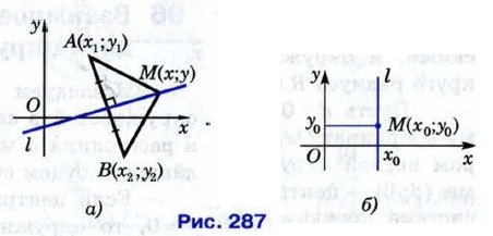 Выведем уравнение прямой l, проходящей через точку М0 (x0; у0) и параллельной оси Оу (рис. 287, б). Абсцисса любой точки М (х; у) прямой l равна x0, т. е. координаты любой точки М (x; у) прямой l удовлетворяют уравнению х = х0. В то же время координаты любой точки, не лежащей на прямой l, этому уравнению не удовлетворяют. Следовательно, уравнение х = х0 является уравнением прямой l. Ясно, что ось Ох имеет уравнение у = О, а ось Оу — уравнение х = 0.