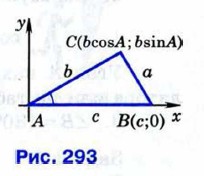 Введём систему координат с началом в точке А так, как показано на рисунке 293. Тогда точка В будет иметь координаты (с; 0), а точка С — координаты (b cos A; b sin А). По формуле расстояния между двумя точками получаем: ВС2 - a2 = (b cos А - с)2 + b2 sin2 А =