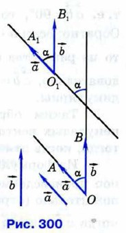Пусть и — два данных вектора. Отложим от произвольной точки О векторы и Если векторы и не являются сона- правленными, то лучи О А и О В образуют угол АОВ (рис. 300). Градусную меру этого угла обозначим буквой α и будем говорить, что угол между векторами и равен α. Ясно, что α не зависит от выбора точки О, от которой откладываются векторы и (пользуясь рисунком 300, докажите Это). Если векторы и сонаправлены, в частности один из них или оба нулевые, то будем считать, что угол между векторами и равен 0°. Угол между векторами и обозначается так: