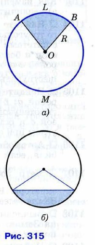 § 2. Длина окружности и площадь круга Площадь кругового сектораКруговым сектором или просто сектором называется часть круга, ограниченная дугой и двумя радиусами, соединяющими концы дуги с центром круга. Дуга, которая ограничивает сектор, называется дугой сектора. На рисунке 315, а изображены два сектора с дугами ALB и AM В. Первый из этих секторов закрашен.