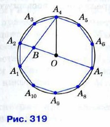 1134. Диагонали A1A4 и А2А7 правильного десятиугольника A1A2...A10, вписанного в окружность радиуса R, пересекаются в точке В (рис. 319). Докажите, что: a) A2A7 = 2R; б) A1A2B и ВА4O— подобные равнобедренные треугольники; в) А1А4 - A1A2 = R.
