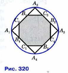 1136. Квадрат A1A2A3A4 вписан в окружность радиуса R (рис. 320). На его сторонах отмечены восемь точек так, что A1B1 = А2В2 = А3В3 = А4В4 = A1C1 = А2С2 = А3С3 = А4С4 = R. Докажите, что восьмиугольник B1C3B2C4B3C1B4C2 правильный, и выразите площадь этого восьмиугольника через радиус R.