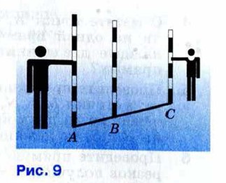 Аналогичный приём используется для «проведения» длинных отрезков прямых на местности. Этот приём заключается в следующем. Сначала отмечают какие-нибудь точки А и В. Для этой цели используют две вехи — шесты длиной около 2 м, заострённые на одном конце для того, чтобы их можно было воткнуть в землю. Третью веху ставят так, чтобы вехи, стоящие в точках А и В, закрывали её от наблюдателя, находящегося в точке А (точка С на рисунке 9). Следующую веху ставят так, чтобы её закрывали вехи, стоящие в точках В и С, и т. д.