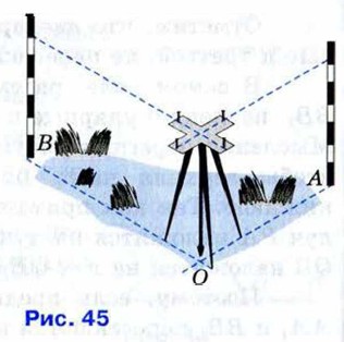 Чтобы построить на местности прямой угол с заданной стороной ОА, устанавливают треножник с экером так, чтобы отвес находился точно над точкой О, а направление одного бруска совпало с направлением луча ОА. Совмещение этих направлений можно осуществить с помощью вехи, поставленной на луче. Затем провешивают прямую линию по направлению другого бруска (прямая ОВ на рисунке 45). Получается прямой угол АОВ. В геодезии для построения прямых углов используют более совершенные приборы, например теодолит.